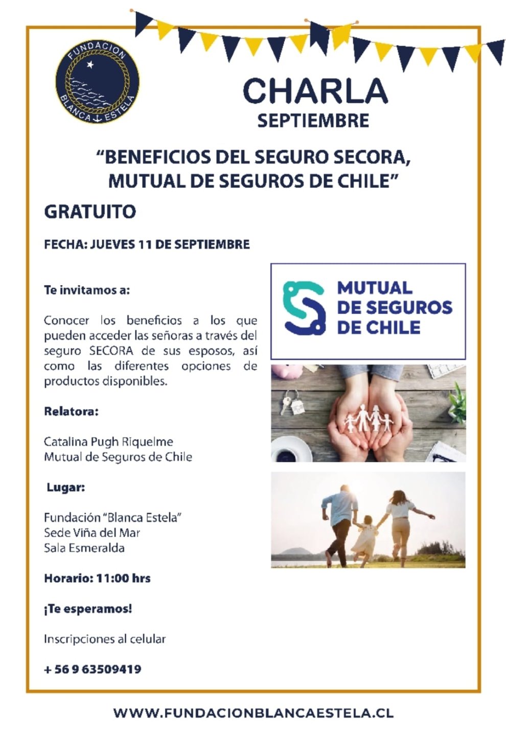La Fundación "Blanca Estela", sede Viña del Mar, tiene el agrado de invitar a la Familia Naval a participar en la charla “Beneficios del Seguro SECORA, Mutual de Seguros de Chile”, una instancia gratuita que busca entregar información relevante sobre las coberturas y alternativas disponibles para las señoras beneficiarias del seguro de sus esposos.