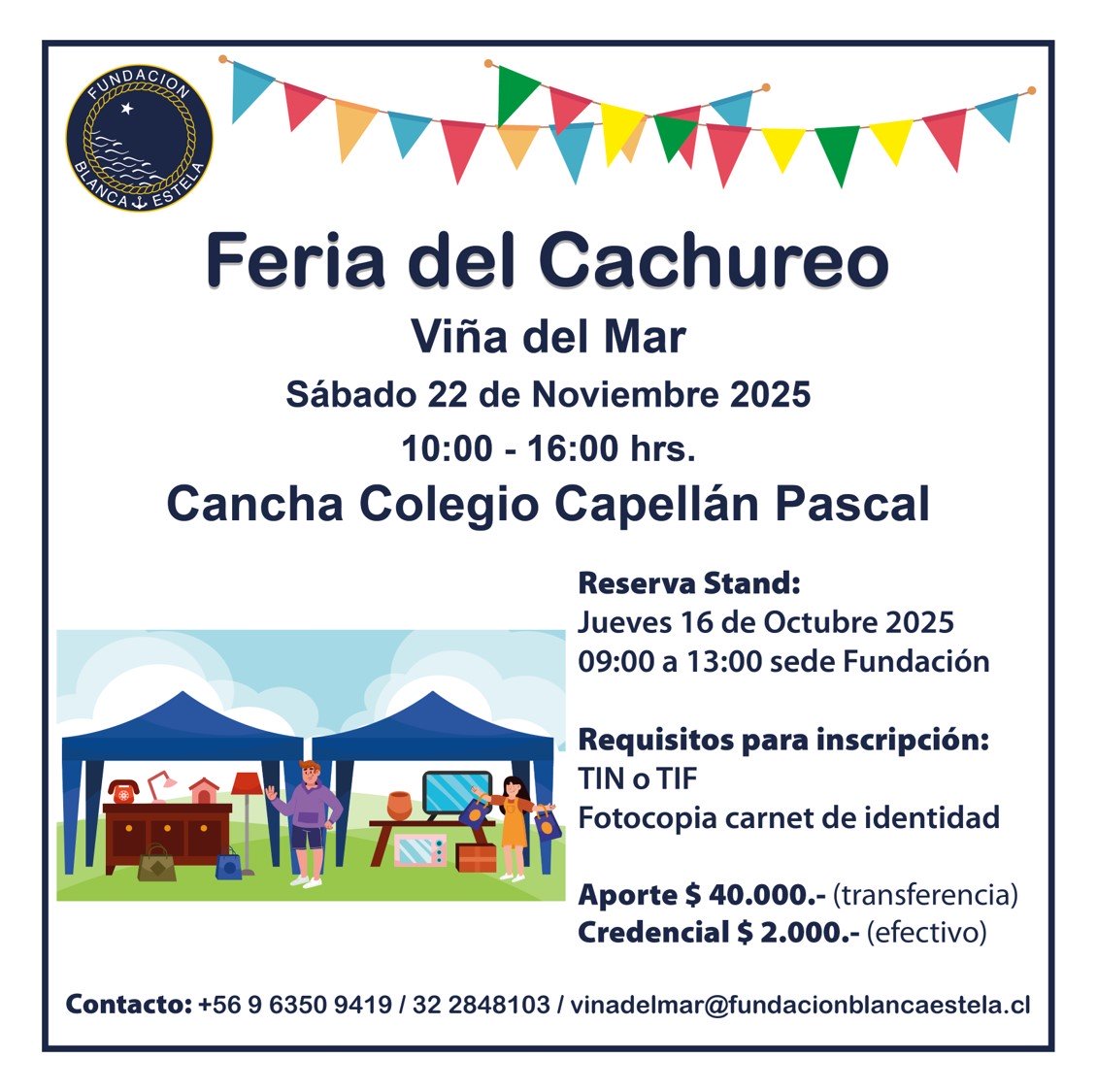 El día sábado 22 de noviembre la Fundación "Blanca Estela" realizará su tradicional Feria del Cachureo 2025, en las dependencias deportivas del Colegio Capellán Pascal, ubicadas al interior de la Base Naval Las Salinas, Viña del Mar, con el fin reunir fondos para las distintas actividades de ayuda social que realiza en apoyo a la Familia Naval.