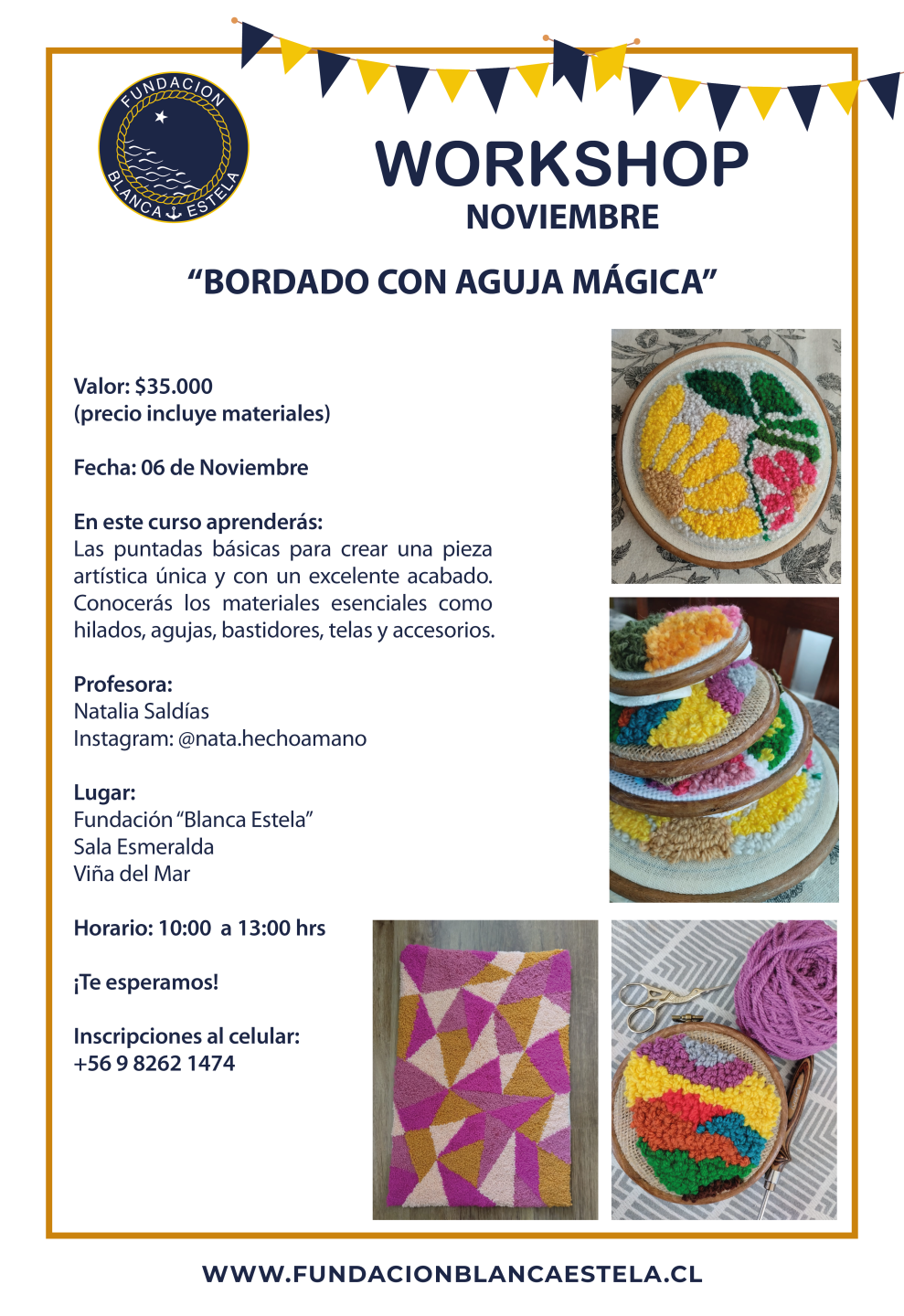 La Fundación "Blanca Estela" invita a toda la Familia Naval a participar del Workshop de Bordado con Aguja Mágica, una entretenida jornada que permitirá aprender una técnica artística en tendencia, ideal para quienes buscan explorar su creatividad y disfrutar de un momento de bienestar.